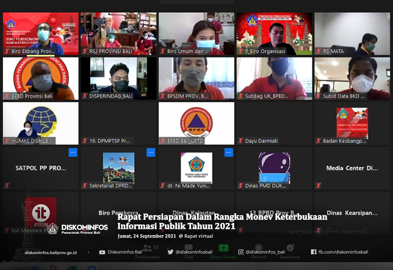 Jumat (24/9), Dinas Komunikasi, Informatika, dan Statistik Provinsi Bali melalui Bidang Informasi dan Komunikasi Publik Seksi Layanan dan Pengelolaan Informasi Publik menyelenggarakan Rapat Persiapan Dalam Rangka Monitoring dan Evaluasi (Monev) Keterbukaan Informasi Publik Tahun 2021 secara daring yang diikuti oleh Organisasi Perangkat Daerah (OPD) dilingkungan Pemerintah Provinsi Bali yang bersentuhan dengan Pelayanan Publik.